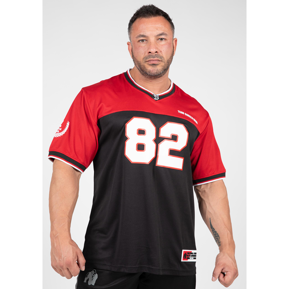 Зануртесь у спадок спорту з Trenton Football Jersey. З класичним V-вирізом та широкими рукавами до ліктя, ця футболка не лише виблискує стилем, але також забезпечує відмінний комфорт. Виготовлена з дихаючої поліестерової сітки, вона гарантує, що ви залишаєтеся прохолодними і сухими під час візиту в спортзал. Футболка Trenton вражає погляд своїми багатьма емблемами і принтами, включаючи легендарну фразу "Team Gorilla Wear" та великий принт 82, що посилається на рік заснування нашого відомого бренду.