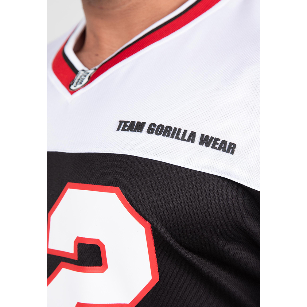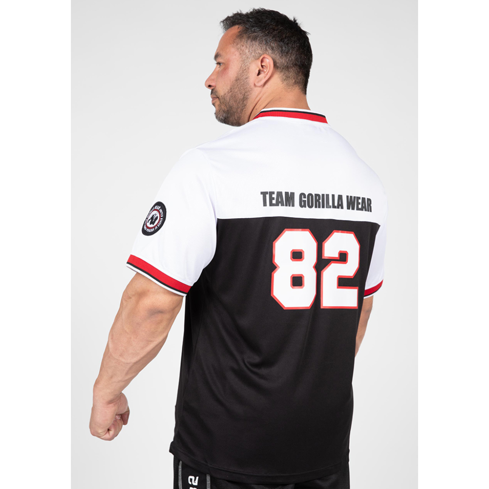 Зануртесь у спадок спорту з Trenton Football Jersey. З класичним V-вирізом та широкими рукавами до ліктя, ця футболка не лише виблискує стилем, але також забезпечує відмінний комфорт. Виготовлена з дихаючої поліестерової сітки, вона гарантує, що ви залишаєтеся прохолодними і сухими під час візиту в спортзал. Футболка Trenton вражає погляд своїми багатьма емблемами і принтами, включаючи легендарну фразу "Team Gorilla Wear" та великий принт 82, що посилається на рік заснування нашого відомого бренду.