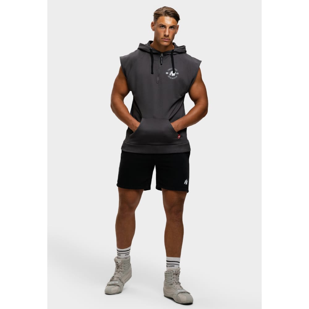 Тренуйся наполегливо. Живи сміливо. Безрукавка Huntley Sleeveless Hoodie — це ідеальний варіант для тренувань у спортзалі, де поєднуються функціональність і стиль. Незалежно від того, чи ти тренуєш плечі, чи розминкаєшся, ця безрукавка з облягаючим кроєм забезпечує повну свободу рухів і дихаючий комфорт. Тканина з бавовняної суміші м'яка на дотик, але міцна, а капюшон і кишені-кенгуру додають функціональності. З яскравим логотипом Gorilla Wear на грудях ви не просто тренуєтеся — ви демонструєте свою цілеспрямованість. Ніяких виправдань. Ніяких обмежень. Тільки прогрес.